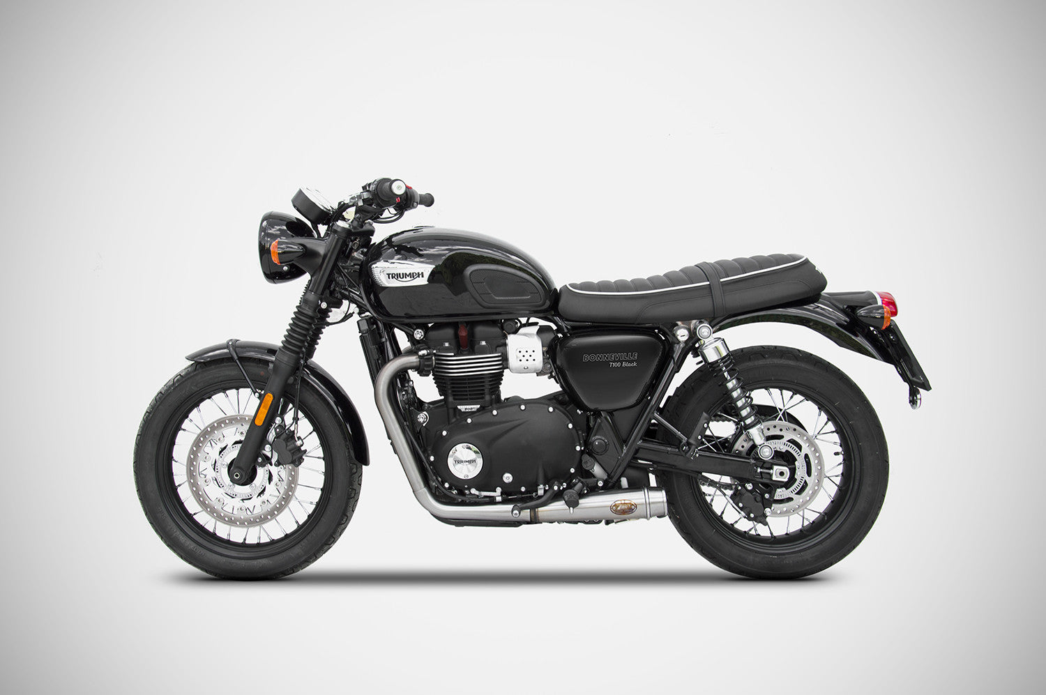 Theracing full kit for the Triumph Bonneville T100, entirely handmade in Italy, includes headers and a silencer made of AISI 304 stainless steel. The system delivers increased power and a significant weight reduction of -9.9 kg (-21.8 lbs) compared to the original exhaust, improving throttle response and handling. Available in satin, Cerakote black, or mirror-polished finishes, the kit features a low-mounted layout that perfectly matches the frame and proportions of the T120. The sound is deeper and fuller, enhancing the character of the British twin-cylinder. NOTE: This exhaust removes the original catalytic converter. NOTE: The exhaust can be mounted in a rearward position by purchasing the 'REAR EXHAUST CONVERSION KIT' available as an optional accessory. Compatibility: BONNEVILLE T100 (1723) and T120 (1623)