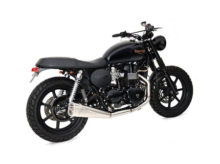 The Conical full kit for the Triumph Bonneville T100, entirely handmade in Italy, includes headers and a silencer made of AISI 304 stainless steel, with a stainless steel end cap. It ensures a weight reduction of -3.8 kg (-8.4 lbs)compared to the original system, while also improving the bikes aesthetics and performance. Available in a satin or black finish, the kit features a classic low-mount layout, perfectly integrated with the elegant profile of the T100. Its deep sound enhances the bikes vintage soul. Available in Euro 2 homologated or racing. Installation is simple and requires no additional modifications. RACING version compatible with BONNEVILLE T100 and THRUXTON 900 (2001 - 2016) HOMOLOGATED version compatible with BONNEVILLE T100 and THRUXTON 900 (2001 - 2007)