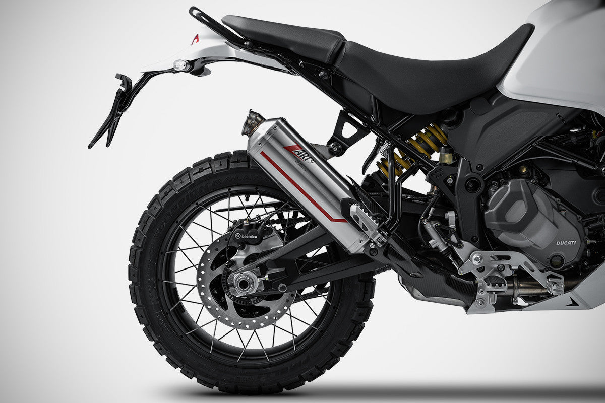The Zard Sabbia slip-on for the DucatiDesert X represents the perfect blend of rally-raid-inspired design and cutting-edge technology. Sabbia is the Zard collection dedicated to theDucati Desert X,YamahaTnr 700and Aprilia Tuareg 660, inspired by the world of African rally raids and defined by a modern, innovative design. Handcrafted inItaly from AISI 304 stainless steel, the slip-on comes standard with a carbon fiber heat shield. It is available in bothracingor E5 homologated version. Weight is significantly reduced from 3.3 kg for theOEM exhaust to just 2.6 kg for thehomologated version and 2.2 kg for the racingversion, improving handling. The power increase is+1.6 hp for theracingversion and +1 hp for the homologatedone. The exclusive design of the Sabbia, distinguished by the red line and Zard logo screen-printed with heat-resistant paint, is the result of a close collaboration between Zard's Centro Stile and the R&D team, drawing inspiration from the great African rally raids. Designed for enduro-touring bikes from 650cc to 1000cc, it integrates perfectly with the Ducati Desert X, delivering a bold, adventurous look and the unmistakable Zard sound. The slip-on for the Ducati Desert Xdoes not requires ECU remapping, is easy to install and is ready to useright out of the box.