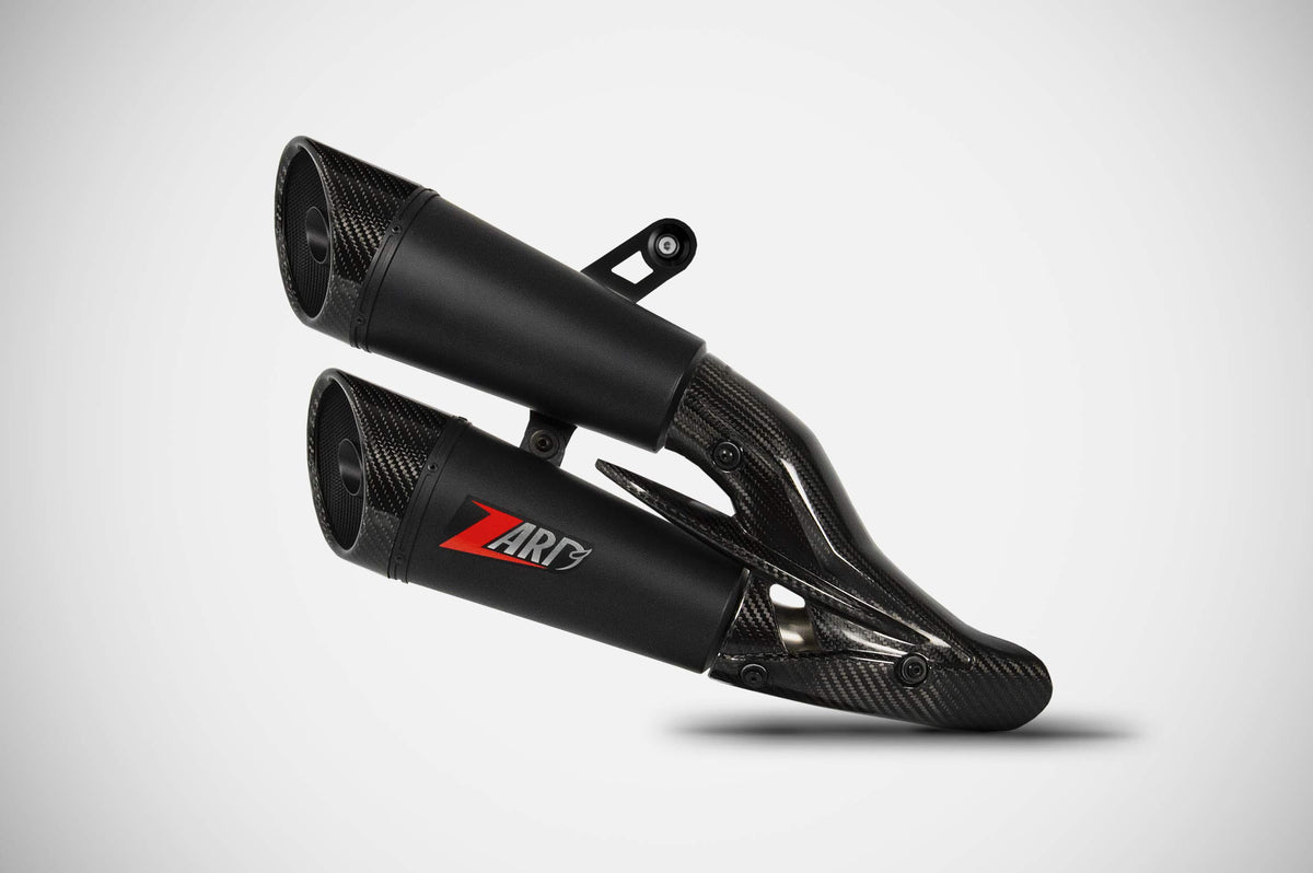 Double silencer available in racing or Euro 5 approved version High-temperature resistant black painting Carbon silencer with exclusive aerodynamic design. The latter, created by the Zard "Centro Stile", is the result of careful aerodynamic research and owes its complex shapes to a perfect balance between design and function, improving the passage of airflow over the exhaust body and optimal heat dissipation. Zard silencer weight: 3.1 kg The installation of the Monster 937 exhaust by Zard does not require any modifications to the original ECU. Cutting-edge design with the distinctive sound of Zard products!