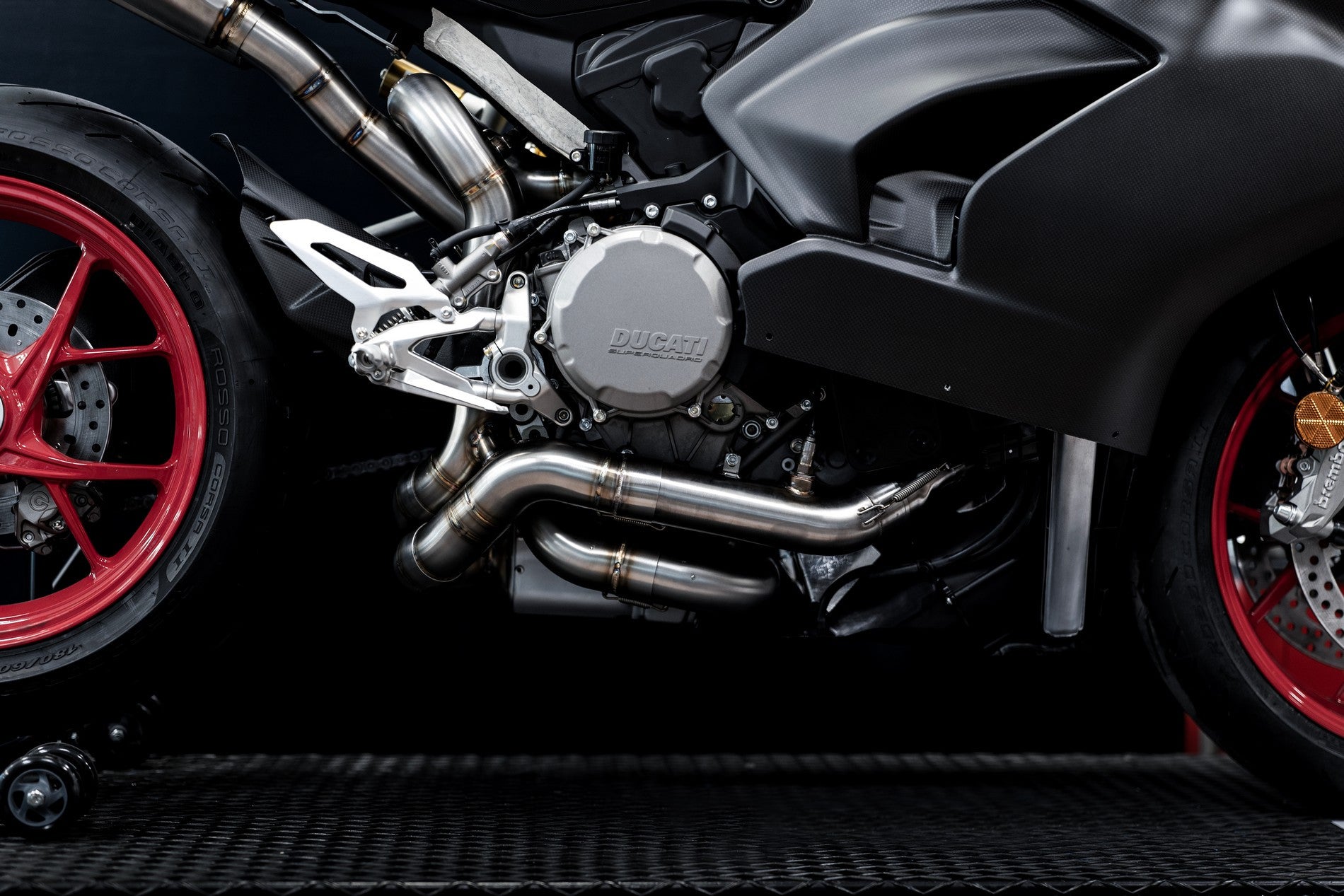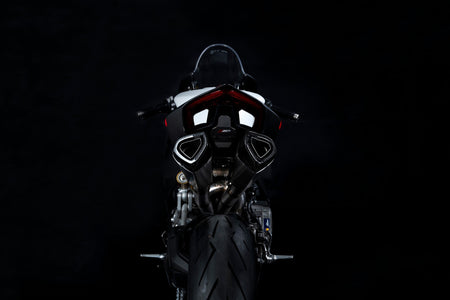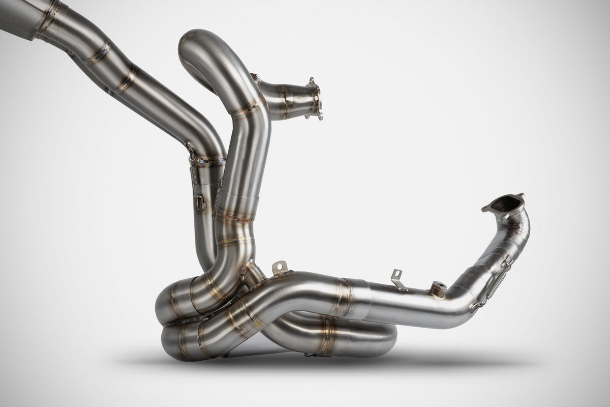 The Zard exhaust system dedicated to the Ducati Panigale V2 is a complete racing 2>1>2 system developed to ensure maximum performance, exclusive design and a unique sound. The two titanium silencers with carbon fiber end caps are repositioned under the tail, featuring an asymmetrical triangular profile that enhances the aggressive lines of the Panigale V2. The kit includes stainless steel headers, a Y link pipe and titanium silencers with carbon fiber end caps. Also included are the Sprint Filter air filter and the UpMap ECU, specifically developed for this exhaust to ensure top performance and reliability. The system delivers a power increase of +7.5 HP and a significant weight reduction of -5.1 kg, bringing the total weight down to just 7.8 kg. It is also the only full kit for the Panigale V2 that allows you to keep all the original components of the bike such as passenger footpegs, license plate holder and radiator shroud, improving performance without altering the original design. Every ZARD exhaust is handmade in Italy by skilled technicians and passionate motorcyclists, with artisanal craftsmanship that translates into superior build quality, durability, and performance. The collaboration with GP Tecnica, a benchmark in the luxury automotive sector, has led to the development of cutting-edge technological solutions that enhance this exhaust both functionally and aesthetically. Premium materials such as titanium, stainless steel, and carbon fiber further emphasize its high-end construction. The Ducati Panigale V2 equipped with the ZARD Full Kit represents the perfect balance of technology, design and performance, delivering an unmistakable sound and exclusive riding experience. NOTE: the kit includes Sprint Filter air filter and UpMap ECU