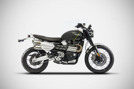 The Slip-Ons for the Triumph Scrambler 1200, crafted by Officine Italiane Zard, enhance the bikes aesthetics while also delivering improved engine performance. Entirely handmade in Italy, the two silencers are made from AISI 304 stainless steel, with sleeves in stainless steel and end caps available in either stainless steel or carbon fiber, ensuring superior durability and strength. The kit is available in a satin or black finish. With increased power and a reduced total weight of just 3.9 kg, the Zard kit is lighter than the stock exhaust, offering a weight saving of -3.4 kg. This improves handling and responsiveness. Its compact design and optimized layout enhance weight distribution and overall performance, for an exceptional riding experience. The system is engineered to deliver a deep sound that perfectly matches the spirit of the Triumph Scrambler 1200. Installation is simple and requires no additional modifications. It is available in both Euro 4 homologated and racing versions.