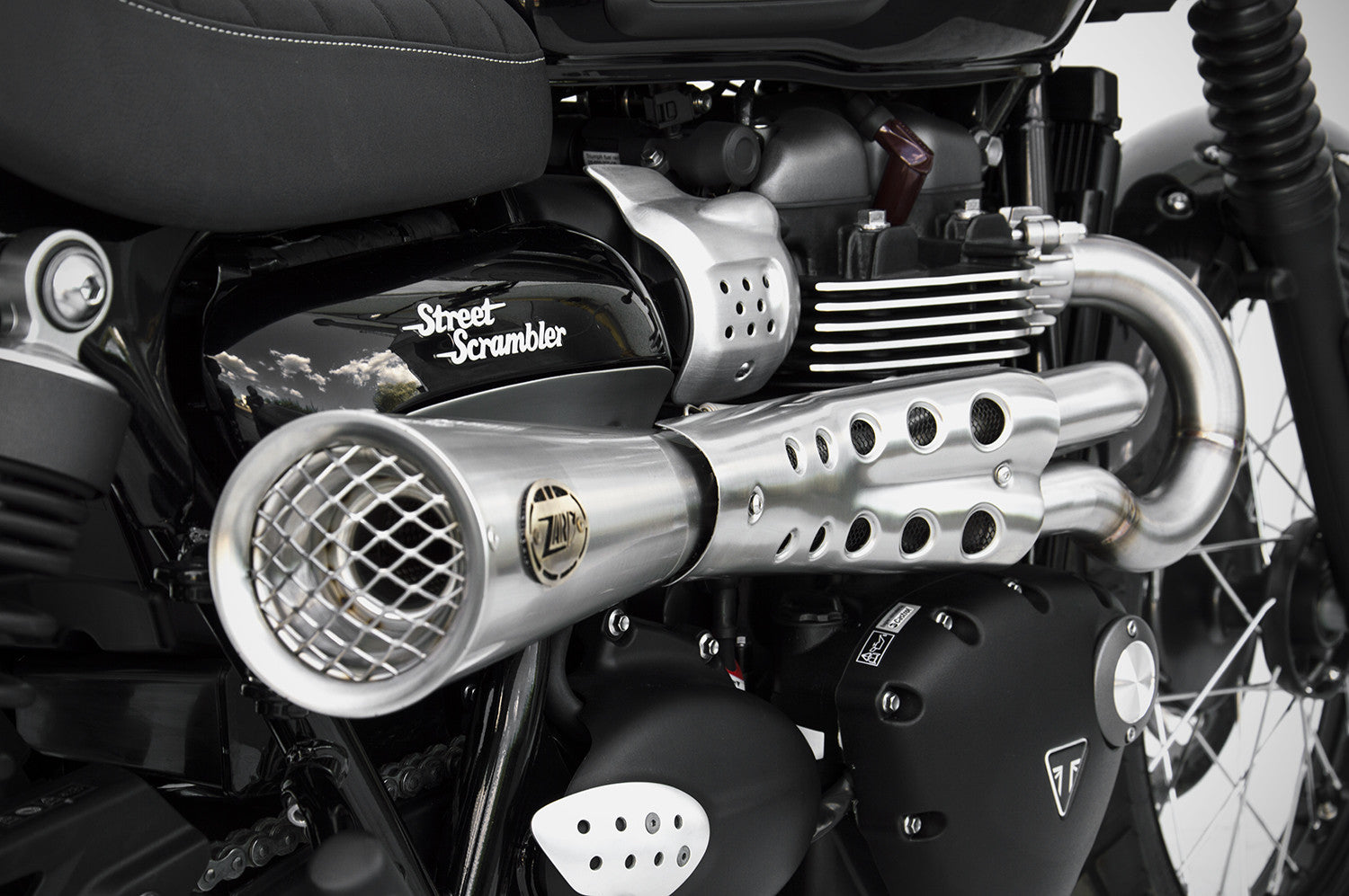 The "Tiger 70" Full Kit for the Triumph Scrambler 900, entirely handcrafted in Italy, includes a header and silencer made of AISI 304 stainless steel, with both the sleeve and end cap in stainless steel. It is available in a satin finish or Cerakote black, with the option to add a bronzed end cap. The entire system stands out for its significant power increase, weight reduction, and a deep sound that enhances the scrambler identity of the bike. The 2>1 layout gives the bike a sleek and muscular look. The total weight of the Zard kit is just 3.7 kg (8.2 lbs), saving -6.1 kg (-13.4 lbs) compared to the stock exhaust, contributing to a significant reduction in the overall weight of the motorcycle. This product is not street legal. The design integrates perfectly with the classic lines of the bike. Not street legal. Compatible with Triumph Street Scrambler 900 (20172023)