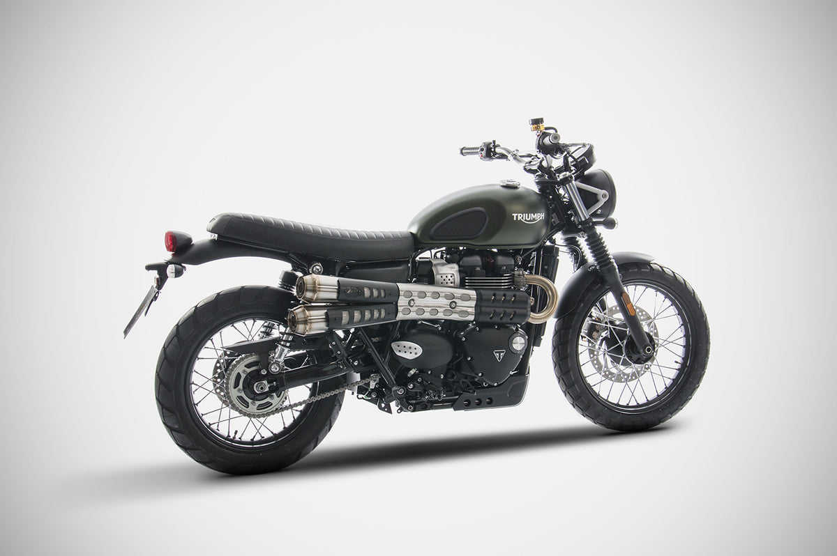 The Conical Slip-On for the Triumph Scrambler 900, created by Officine Italiane Zard, enhances engine performance while accentuating the bikes design. Entirely handmade in Italy, the system is composed of two AISI 304 stainless steel silencers, with both sleeve and end cap in stainless steel, ensuring superior strength and durability. The kit is available in a satin finish, satin finish with black heat shield, or black Cerakote, giving the bike an elegant and modern look. With a weight of only 3.4 kg (7.5 lbs), the Zard kit reduces the weight of -2 kg (-4.4 lbs) from the stock exhaust, improving the bikes handling and responsiveness. The system is designed to deliver a deep sound. Installation is simple with no additional modifications required, and it is available in Euro 5 homologated or racing versions. NOTE: the heat shield of the black ceramic coated version comes with a silver mesh insert. Compatible with Triumph Street Scrambler 900 (20172023)