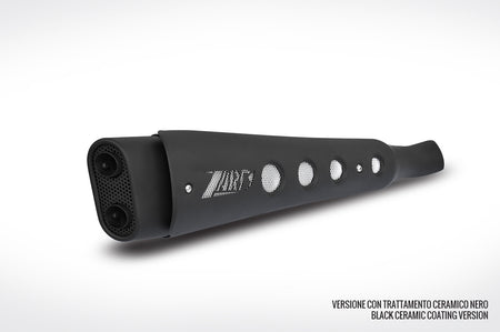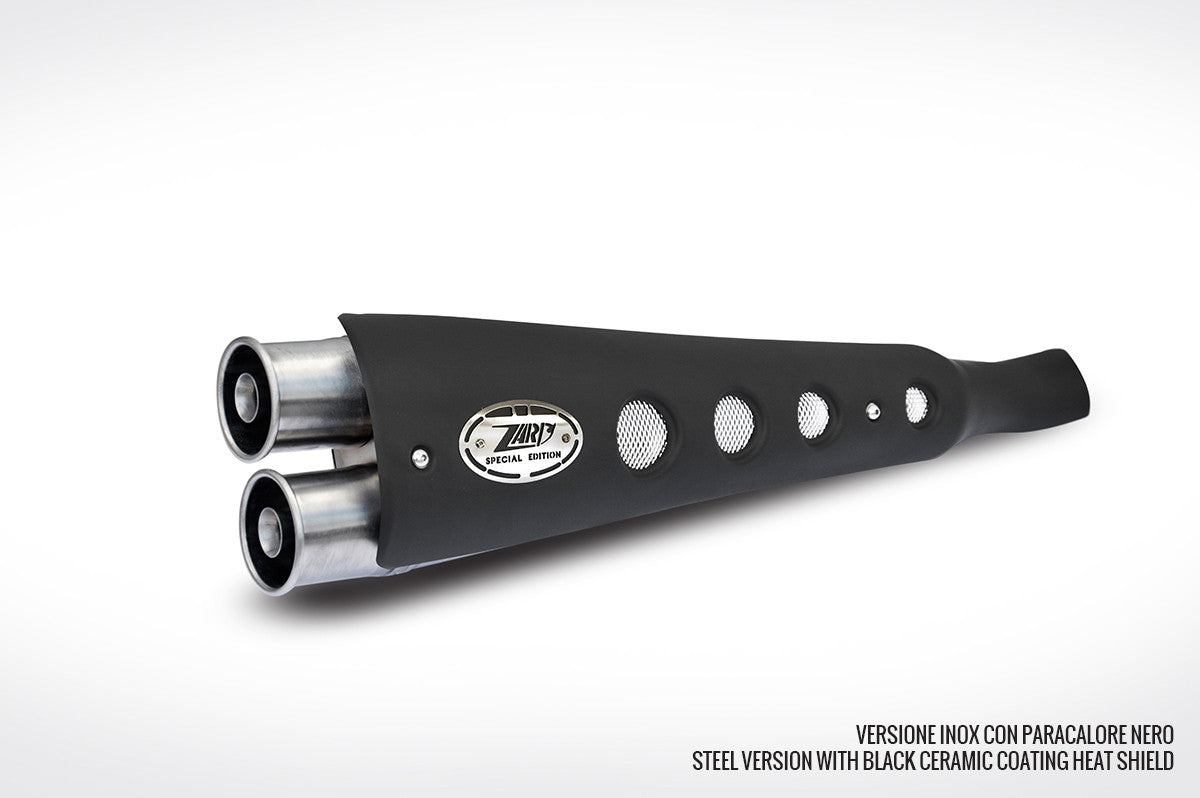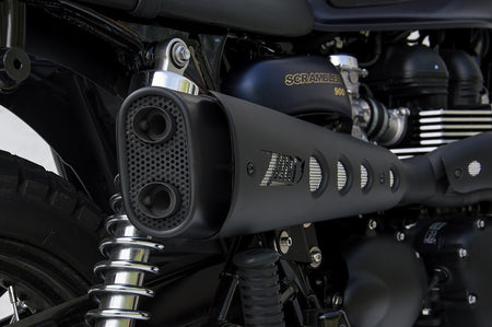 The "Conical" High Racing Full Kit for the Triumph Scrambler 900 is entirely handcrafted in Italy, it includes a header and silencer made of AISI 304 stainless steel, with sleeve and end cap in stainless steel. It is available in a satin finish, black Cerakoteor with a black contrast heat shield. The entire system stands out for its lightness, only 3.9 kg (8.6 lbs), -7.7 kg (-17 lbs) from the original system, durability and a deep and distinctive sound that captures the true Scrambler spirit. The high-impact visual design enhances the classic lines of the bike. Available in Euro 3 homologated or racing versions. NOTE: the heat shield comes with both black and silver mesh inserts. Racing version compatible with Triumph Scrambler 900 (20012016)