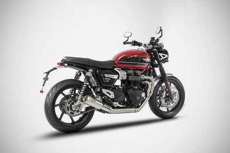 The "SP" Full Kit for the Triumph Speed Twin 1200 is designed for those seeking the best in terms of sound, performance, and design. Made by Officine Italiane Zard, this system, enhanced by refined details like the laser-cut bronzed plate, is entirely handmade in Italy, it consists of a 2-into-1 header and two AISI 304 stainless steel silencers, with a stainless steel sleeve and end cap available in either stainless steel or carbon fiber. Available in a satin or black finish. The sound produced is full and deep, perfectly in line with the spirit of the Speed Twin 1200. The compact layout and low mounting enhance both the balance and aesthetics of the bike. The kit is available exclusively in racing version, not approved for road use. With a significant power increase and a total weight of 4.1 kg (9 lbs), the Zard Full Kit offers a substantial weight saving over the original system of -5.7 kg (-12.6 lbs), contributing to an overall improvement in performance. Also compatible with Triumph Thruxton R/RS 1200 (20212023) in racing version