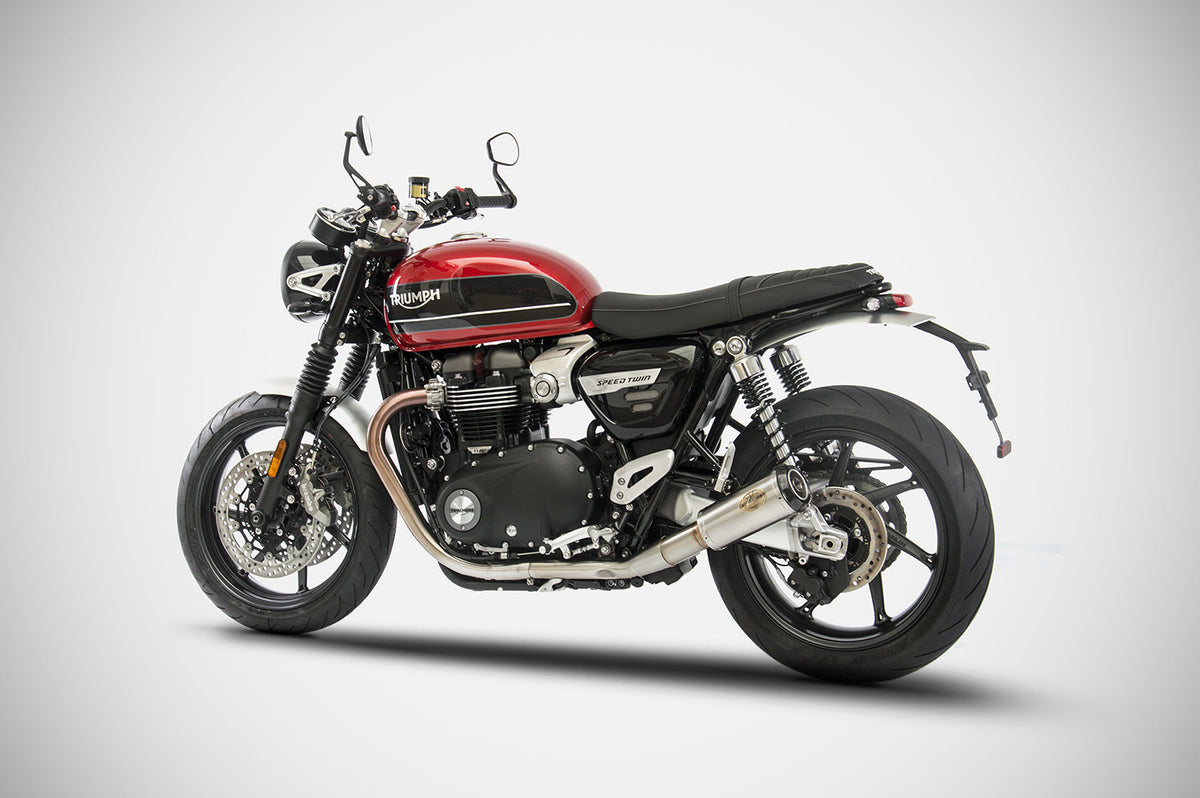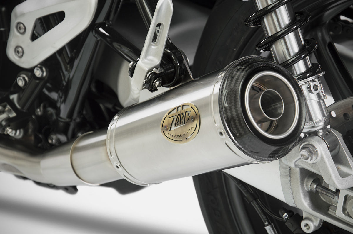 The "SP" Slip-Ons for the Triumph Speed Twin 1200 are designed for those looking for an immediate upgrade in terms of sound, performance, and style, without giving up a refined and racing-inspired design. Developed by Officine Italiane Zard, this system enhances the bike's personality with refined details such as the laser-cut bronzed tag. Handcrafted in Italy, the system consists of two AISI 304 stainless steel silencers, with a sleeve in stainless steel and end cap available in either stainless steel or carbon fiber. Available in Euro 4 homologated or racing version. With a significant power increase and a-2 kg (-4.4 lbs) weight reduction, weighing just 3.8 kg (8.4 lbs), the Zard Slip-Ons provide a lighter and more responsive ride. The resulting sound is deep and full-bodied, perfectly matching the character of the Speed Twin 1200. Installation is simple, with no need for structural modifications, and the compact design improves both the aesthetics and overall performance of the bike. Racing version compatible with Triumph Thruxton R/RS 1200 (201923)