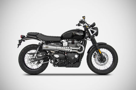 The "Tiger 70" Full Kit for the Triumph Street Scrambler 900, entirely handcrafted in Italy, includes a header and silencer made of AISI 304 stainless steel, with both the sleeve and end cap in stainless steel. It is available in a satin finish or Cerakote black, with the option to add a bronzed end cap. The entire system stands out for its significant power increase, weight reduction, and a deep sound that enhances the scrambler identity of the bike. The 2>1 layout gives the bike a sleek and muscular look. The total weight of the Zard kit is just 3.7 kg (8.2 lbs), saving -6.1 kg (-13.4 lbs) compared to the stock exhaust, contributing to a significant reduction in the overall weight of the motorcycle. This product is not street legal. The design integrates perfectly with the classic lines of the bike. Not street legal. Compatible with Triumph Street Scrambler 900 (20172023)