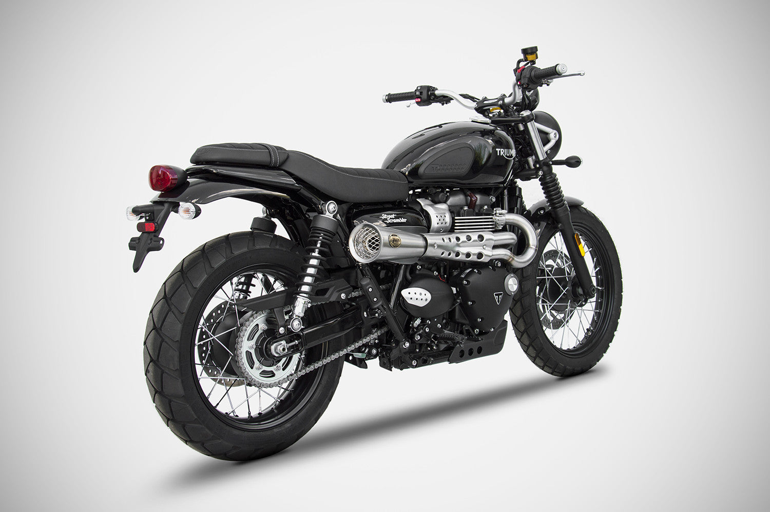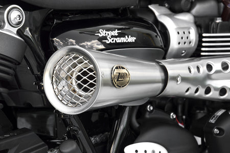 The "Tiger 70" Full Kit for the Triumph Street Scrambler 900, entirely handcrafted in Italy, includes a header and silencer made of AISI 304 stainless steel, with both the sleeve and end cap in stainless steel. It is available in a satin finish or Cerakote black, with the option to add a bronzed end cap. The entire system stands out for its significant power increase, weight reduction, and a deep sound that enhances the scrambler identity of the bike. The 2>1 layout gives the bike a sleek and muscular look. The total weight of the Zard kit is just 3.7 kg (8.2 lbs), saving -6.1 kg (-13.4 lbs) compared to the stock exhaust, contributing to a significant reduction in the overall weight of the motorcycle. This product is not street legal. The design integrates perfectly with the classic lines of the bike. Not street legal. Compatible with Triumph Street Scrambler 900 (20172023)
