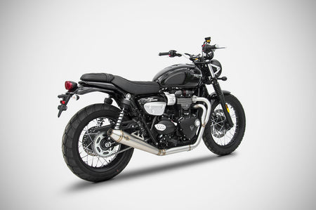 The "Conical" Low Full Kit for the Triumph Street Scrambler 900 entirely handcrafted in Italy, includes a header and silencer made ofAISI 304 stainless steel, with both the sleeve and end cap instainless steel. It is available in asatin finishorCerakote black. The kit is designed to deliver a significant power increase, weight savings, and adeep, engaging soundthat perfectly reflects the scrambler spirit of the bike. The low 2>1 layout gives the bike a bold, muscular look. The total weight of the Zard kit is just4.8 kg (10.6 lbs), offering a-5 kg (-11 lbs) reduction compared to the stock exhaust, resulting in a significant improvement in performance and handling. The exhaustdoes not require ECU remapping, iseasy to install, andready to usestraight away. This product is not street legal. Not compatible with Triumph engine guard Compatible with Triumph Street Scrambler 900 (20172023)