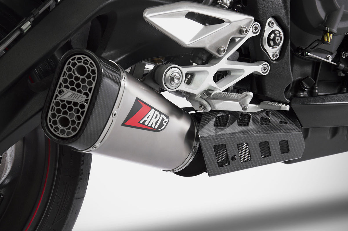 The Slip-On for the Triumph Street Triple 765is the ideal choice for those seeking top performance, exclusive design, and a powerful, distinctive sound. Entirely handcrafted in Italy by Officine Italiane Zard, this silencer is made from AISI 304 stainless steel with a titanium sleeve and standard carbon fiber end cap for a unique and sporty look. This system delivers an aggressive and full-bodied sound, perfectly matching the spirit and power of the Street Triple 765. Its refined and compact design blends perfectly with the lines of the bike, adding character and personality. Available in Euro 4 homologated or racing version. The Zard kit enhances the bikes agility and responsiveness by reducing the total weight by -3.1 kg (-6.8 lbs), bringing it down to just 3.4 kg (7.5 lbs) and optimizing performance. Installation is simple and requires no modifications to the vehicle. Compatible with Speed Triple RS and Moto 2