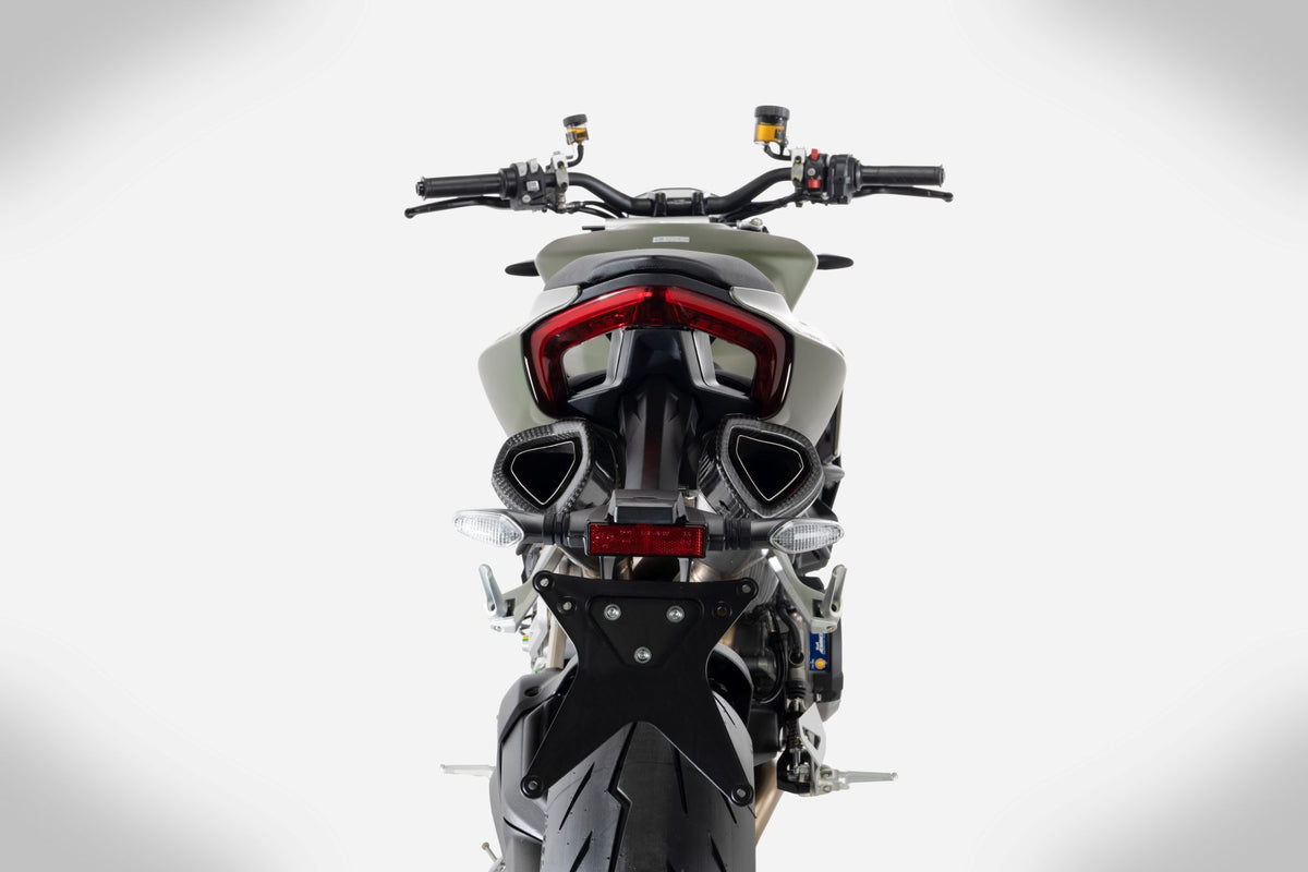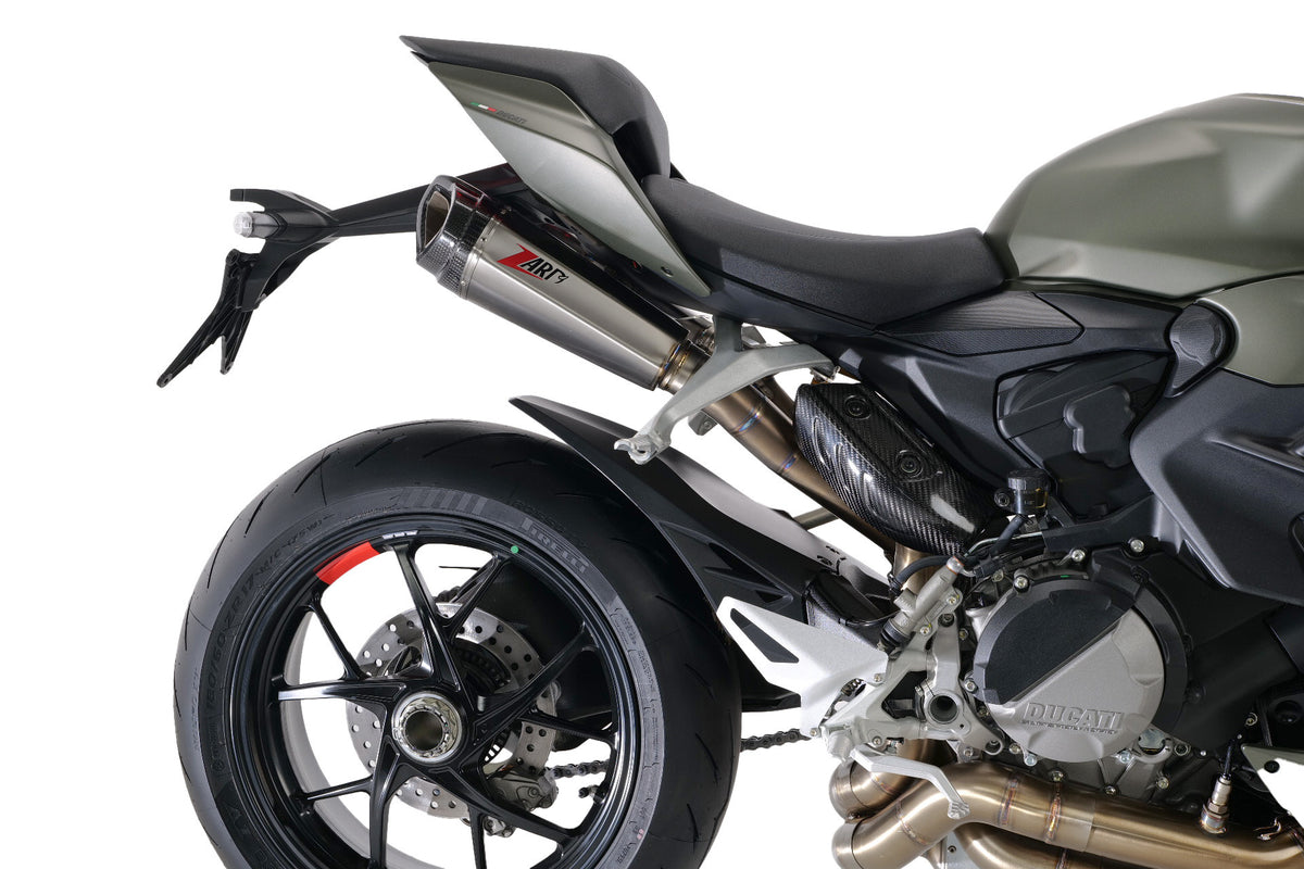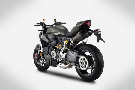 The ZARD Ducati Streetfighter v2 Exhaust is a full racing kit, consisting of stainless steel headers, a "Y" pipe, and titanium mufflers with carbon fiber end caps. The two mufflers have a new housing under the tail and feature an asymmetric triangular design. This kit ensures maximum performance while maintaining the bike's reliability, with a performance increase of +5 hp.